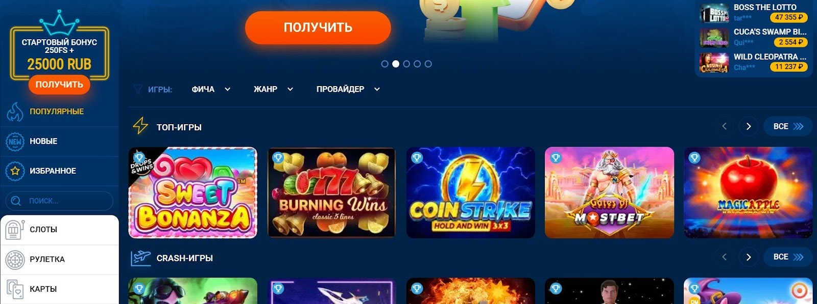 В разделе «Казино» слева игрок видит доступные виды игр – слоты, рулетка, карты, лотереи, джекпоты, Fast Games, виртуальный спорт. Чуть выше расположено несколько подборок – с популярными, новыми, избранными играми. В центре экрана – рекламный виджет, фильтры для поиска и блоки с играми: «Топ-игры», «Crash-игры», «Игры Mostbet» и другие. Если нажать в соответствующем блоке кнопку «Все», откроется весь перечень.