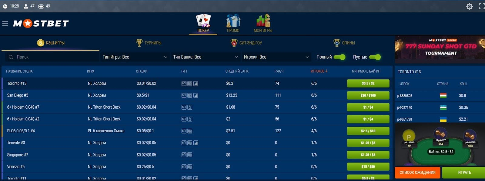 Раздел «Покер» – это полноценный покер-рум. Если он открылся на английском или другом языке, нажмите на иконку шестеренки в правом верхнем углу, перейдите в категорию «Системные настройки» и смените язык на русский. В руме предлагаются кэш-игры, турниры, спины, сит-энд-гоу. Можно отфильтровать столы по типу игры, типу банка, количеству игроков, выбрать полные или пустые. Около каждого стола указаны: