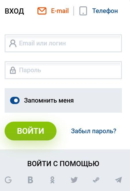 2. Выбрать авторизацию по e-mail (логину), телефону или кликнуть на значок соцсети внизу формы.