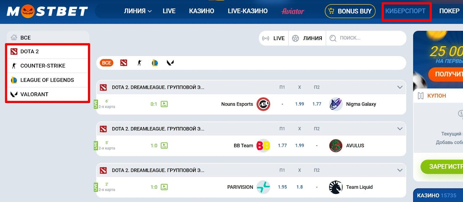 Выбор киберспортивных событий откровенно небольшой на фоне большинства конкурентов. Несмотря на стремительное развитие кибериндустрии, Mostbet как будто застрял году этак в 2019-м и предлагает для ставок исключительно популярные виды киберспорта – Dota 2, CS 2, Valorant, League of Legends. Даже ставки на Warcraft и Starcraft здесь – большая редкость, не говоря уже о менее востребованных дисциплинах. Несмотря на это, на сайте есть отдельный раздел «Киберспорт».