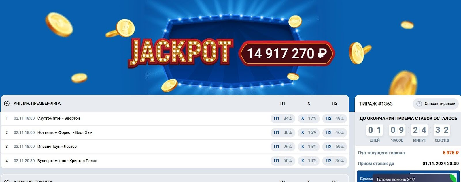 В разделе «Тото» игрок может сыграть в классический тотализатор. БК отбирает 15 матчей (зачастую – футбольных) и предлагает предсказать их исходы – П1, Х или П2. Чтобы получить минимальный выигрыш, нужно угадать 9 исходов. Если угадаете все 15 матчей, получите джекпот.