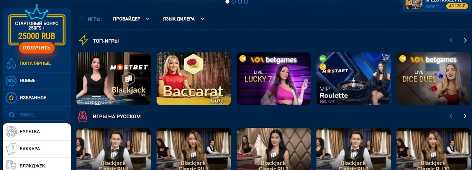Интерфейс и навигация в разделе «Live-казино» – как и в «Казино». На левой панели – подборки и категории с играми, в центре экрана – фильтры (по провайдеру, языку дилера) и блоки с разными видами развлечений (есть даже блок «Игры на русском»). В лайв-казино можно сыграть в различные разновидности покера, рулетки, блэкджека, баккара, сик-бо, колеса фортуны, есть игровые шоу, TV-игры.