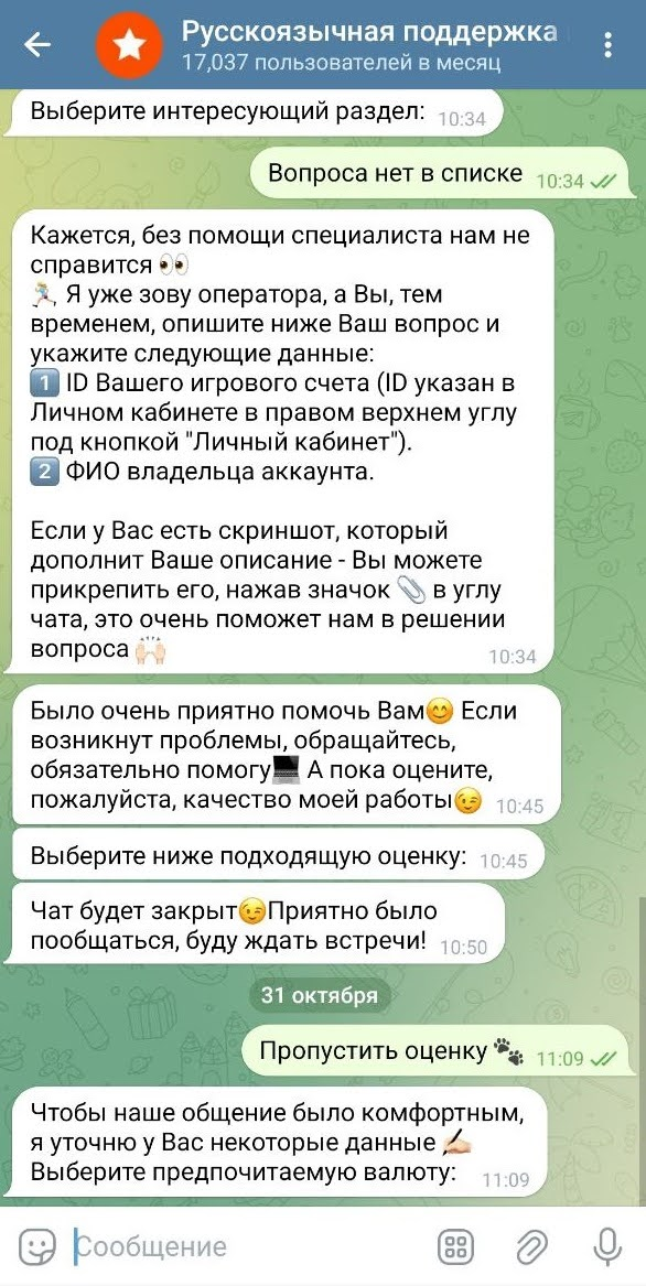 Операторы в чате и в Telegram отвечают на русском языке. Среднее время ожидания первого отклика – 1-2 минуты. Скорость дальнейших ответов зависит от сложности вопроса.